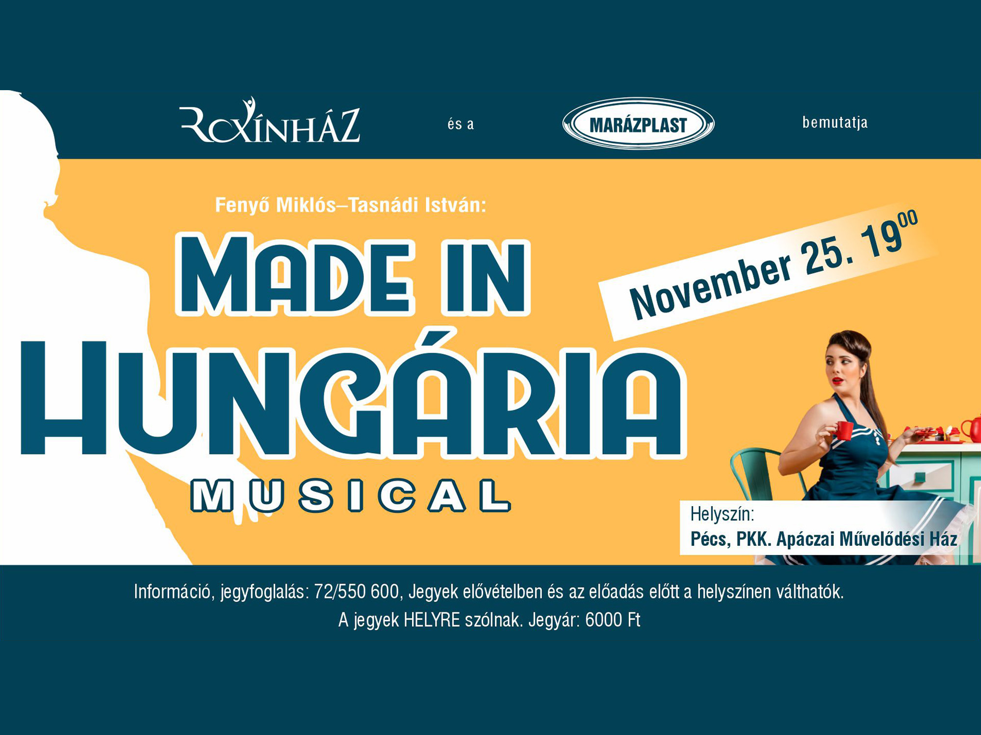 Ha szereted a rock and roll zenét, a hatvanas évek hangulatát és a fiatalság szenvedélyes életérzését, akkor ne hagyd ki a Made in Hungária musicalt! Humorral, romantikával, izgalommal és a legnagyobb Hungária slágerekkel várunk! Éld át a hatvanas évek rock and roll lázadását a Roxínházzal és a Made in Hungária musicallel! Fenyő Miklós és Tasnádi István darabja egy fiatal zenekar kalandjait meséli el, akik az amerikai álom után vágyakozva próbálnak kitörni a szocialista valóságból. A musical bemutatja az akkori ifjúság életérzését, vágyait és problémáit, valamint azokat a társadalmi és politikai körülményeket, amelyek befolyásolták őket. Az előadás tele van humorral, romantikával és izgalommal, és felcsendülnek benne olyan klasszikus Hungária és Fenyő Miklós slágerek, mint a Viva Rock and Roll, a Csókkirály, vagy a Made in Hungária. Az előadásban látható figurák és helyzetek bárminemű összefüggése létező emberekkel nem a véletlen műve.